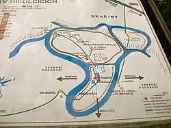The site of the Acropolis would have been a low-lying island in the Morava, which has now been canalised. The Acropolis was surrounded by a stone faced rampart, which would have been reached by a wooded bridge from the outer bailey. The ramparts of the Acropolis enclosed an area of about 6 hectares.[3] There are further extramural settlements surrounding the site. Settlement started possibly in the 8th century AD and continued until the demise of the Great Moravia Empire into the early part 10th century.[4])The excavations started 1955 and have progressed, almost continuously, until the present time.[5]