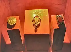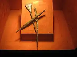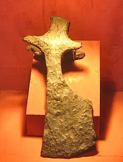 In 1958 the excavations moved to the palace building, to the west of Church 3. The palace had been built of stone, but the stone had been removed and the rectangular outline was preserved by the robber trenches.[9] The building was 26 m long and 10 m wide, with a hall with a fireplace, at the west end and a smaller chamber at the east end.[10] Some rich burials were found in the area and there was extensive evidence of metalworking including goldsmithing.[11] There was some evidence of settlement that pre-dated the Great Moravian Empire including a hoard of clay animal figurines. A number of iron styli for writing on wax tablet were discovered, suggesting that the building would have been used for administrative purposes.