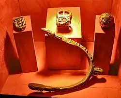 Over 2,500 inhumation burials, mainly in cemeteries of the Great Moravian period, have now been found at Mikulčice. The largest and richest of these cemeteries were those associated with the Basilica church (no. 3) and the Kostelisko site. The detailed study of the chronology and typology of grave goods is yet to be completed.[20] A degree of social stratigraphy can be distinguished in the with the élite warrior burials who are accompanied by their swords and the horse-men who are equipped with gilded bronze spurs and battle axes.