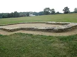 In 1960 excavation moved to an extramural settlement outside the rampart, which had been reached over the river course by a wooded bridge. Extensive remains of wood were recovered including a logboat. Also discovered was a circular stone rotunda church with two semi-circular apses.[14] Also in 1961 the 8th church was excavated, which had a rectangular nave and chancel. The graves of surrounding cemetery were relatively poorly furnished, but in the nave of the church was found a large hoard ironwork, including axes, ploughshares sickles and iron ingots.[15] Also excavated was the bridge leading into the Outer bailey and the surrounding rampart. Finds from river-bed included another longboat, an archery bow, identified as being made from English yew, wicker fish-traps, ladles, spoons, buckets and vats.[14]