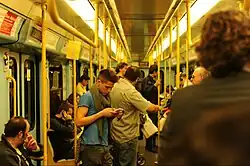 The first 3 lines are heavy rapid-transit lines, with 6-car trains, about 105 m in length. Line 4 and Line 5 are light metro lines, with 4-car trains, about 50 m long.[21][22] They use the same Hitachi Rail Italy Driverless Metro trains with different interior configurations (M4 trains have a seat arrangement similar to those of the first 3 lines).[23]
