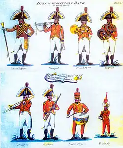 During the 17th and 18th centuries, soldiers marched to the beat of the drum from the day they were recruited in their localities. Drummers, many of them teenagers by the time they were recruited, were also responsible for punishing soldiers who were sentenced to be flogged with whips. The average age of the 304 drummers at Waterloo was 25, with about 10% being boys under 16.[4] The Artillery Band, which were mere "drumme and phifes" for close to 200 years until 1762, was made 'official' that year. Regimental bands in the Foot Guards were first formed between 1783 and 1785.[5] The 1st Foot Guards Band was known as the Duke of York's Band and the 3rd Foot Guards band was known as the Duke of Gloucester's Band.[6] In 1854, during the Crimean War, a parade in Scutari (nowadays Turkey), to celebrate the Queen Victoria's birthday was held, during which twenty British Army bands performed the national anthem. As a result of the bands playing God Save the Queen in different instrumentations and key signatures, the Royal Military School of Music was established that year as the primary training school for all musicians of the army's military bands.[7] In the corps of drums of the line infantry units, while fifes and drums had been played for centuries, beginning in the 1850s bugles began to be adopted in such formations. Until 1837, Army bands sported the Turkish crescent as part of the band percussion section, a tradition introduced from the Ottoman Empire and its military bands in the 18th century.