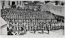 The Second Boer War was a conflict between the British Empire and the Boer republics in South Africa, a culmination of longstanding tensions between the two sides. On 28 September 1899, two weeks before the start of the conflict, the New Zealand House of Representatives approved the formation of a 200-man mounted rifle contingent for service in South Africa, in a show of colonial solidarity aimed at deterring the Boers from fighting.[34] The public responded enthusiastically to the war and calls for volunteers, with opposition to the conflict being minimal.[35][36] Premier Richard Seddon's goal for New Zealand to be the first colonial contingent in South Africa was realised when the first New Zealand contingent arrived in Cape Town on 23 November.[37] After its arrival, the First New Zealand Contingent was attached to Major-General John French's cavalry division.[38]
