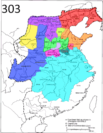 Lord Shang’s overall aim was to mobilize the state for warfare. He saw the great mass of commoners as a resource of the state to further its military objectives; common people were to devote themselves to agriculture to support the army and were also subject to military conscription and corvée labor. They were to be kept ignorant, docile, and obedient, and were kept in line by a code of laws that provided ferocious punishments for all infractions (such as mutilation or being torn apart limb by limb). Household registration was also a form of control. Households were registered in groups of five; each was responsible for the others. If a crime occurred and was not reported by the miscreant’s neighbors in their household group, all five would be subject to punishment along with the actual criminal. Explicit regulations also governed the conduct of government officials, who could be punished both for failing to carry out their stated responsibilities and for encroaching on the duties of others. In general the civilian government was subordinated to the armed forces and the chief means of advancement in rank was prowess on the battlefield, measured by the number of enemy heads taken. In the end Shang Yang overreached himself and, by amassing too much power, incurred the jealousy of others. After the death of Lord Xiao, Shang Yang was accused of treason and executed by being tied to two chariots and torn apart. But his reforms endured, launching Qin on a century-long drive for power and continuing to form the basis of Chinese law during the imperial age.[35]