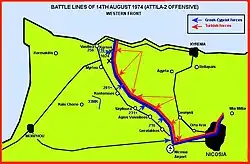 At 23:00, the Greek Cypriot mountain commando forces launched a coordinated night attack just north of the Agyrta-Nicosia enclave, attempting to secure and blockade the Agyrta-Nicosia pass through the Pentedaktylos mountains. The 31MK and 33MK Commando attacked from the west, while the 32MK and 34MK Commando attacked from the east.[37]