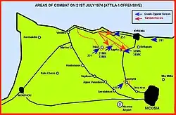 At Kyrenia, the 251st battalion had now moved to the village of Trimithi to mount its defence of the town, while the 241st and Engineer battalion moved east of Kyrenia, with the latter tasked to mining the coastline. At the Agyrta-Nicosia pass, the Greek Cypriot mountain commando forces achieved their objectives, with the 31MK and 33MK arriving from the west to capture the Kotsakagia mountain top, while the 32MK arrive from the east to force a Turkish retreat from the pass.[37] In a disastrous strategic move, the four Greek Cypriot mountain commando battalions were ordered to move from the Pentedaktylos mountains (where they had created a virtual blockade across the line of a Turkish bridgehead) and sent in the direction of Agios Pavlos.[31] The 187MPP artillery battalion, which was badly damaged by Turkish air attack at its camp the previous morning, went into battle with just four surviving 100 mm guns out of its original twelve. The previous day, it had fired a number of shots at the Turkish Cypriot enclave in northern Nicosia, as well as at Saint Hilarion. On the 21st, it moved to a new position at Gerolakkos under cover of night, and shelled Saint Hilarion in support of National Guard and ELDYK forces.[41]