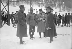 At the 1928 Winter Olympics, in St. Moritz, Switzerland, a military patrol competition was held. Because of a snowstorm the night before the competition, the start of the event was delayed 45 minutes to the cleaning up of the track. The competition was contested over a 30 km (19 mi) distance with an elevation difference of 1,100 m (3,600 ft). The starting point was on a height of 2,108 m (6,916 ft), the highest point at 2,877 m (9,439 ft), and the goal in the valley at 1,850 m (6,070 ft).[1] Nine countries with 36 military patrol runners participated in this event.
