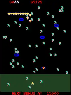 The player no longer takes the role of the "Bug Blaster" from Centipede, but instead takes the role of an elf called the "Archer". The object of the game is to destroy a millipede that advances downward from the top of the screen. The millipede travels horizontally until it either hits an obstacle or reaches the edge of the screen, after which it drops one row and reverses direction. Once it enters the player's gray maneuvering area, it stays there and extra heads appear at intervals until both they and the millipede are destroyed. Shooting a body segment splits the millipede in two, with the rear portion sprouting its own head. A collision with any enemy costs the player one life.