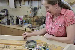 She uses her own developed unique method for decorating the harpsichord body and its legs called marbling.