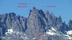 The peaks were named in 1868 by the California Geographical Survey, which reported: "To the south of Mount Ritter are some grand pinnacles of granite, very lofty and apparently inaccessible, to which we gave the name of 'the Minarets.'"[6] Seventeen of the Minarets have been given unofficial names, including Michael Minaret, Adams Minaret, Leonard Minaret, and Clyde Minaret. Clyde Minaret, named after Norman Clyde, is the tallest of the spires. The Southeast Face Route of Clyde Minaret is a technical rock climb featured in Fifty Classic Climbs of North America.[7]
