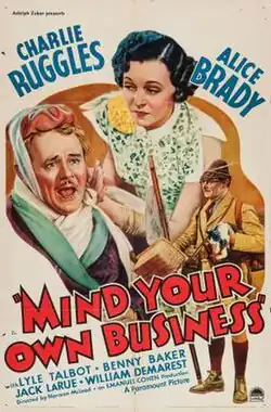 Mind Your Own Business is a 1936 American comedy film directed by Norman Z. McLeod and written by John Francis Larkin and Dore Schary. The film stars Charlie Ruggles, Alice Brady, Lyle Talbot, Benny Baker, Gene Lockhart, and Jack La Rue. It was released on December 18, 1936 by Paramount Pictures.[1][2]