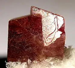 When minerals react, the products will sometimes assume the shape of the reagent; the product mineral is termed a pseudomorph of (or after) the reagent. Illustrated here is a pseudomorph of kaolinite after orthoclase. Here, the pseudomorph preserved the Carlsbad twinning common in orthoclase.