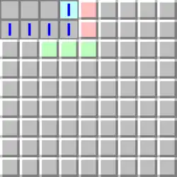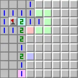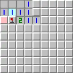 A player selects a cell to open it. If a player opens a mined cell, the game ends. Otherwise, the opened cell displays either a number, indicating the number of mines vertically, horizontally or diagonally adjacent to it, or a blank tile (or "0"), and all adjacent non-mined cells will automatically be opened. Players can also flag a cell, visualised by a flag being put on the location, to denote that they believe a mine to be in that place.[1] Flagged cells are still considered unopened, and a player can click on them to open them.[2] In some versions of the game when the number of adjacent mines is equal to the number of adjacent flagged cells, all adjacent non-flagged unopened cells will be opened, a process known as chording.[2]