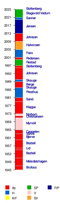 Jens StoltenbergTrygve Slagsvold VedumJan Tore SannerSiv JensenSigbjørn JohnsenKristin HalvorsenPer Kristian FossJens StoltenbergSigbjørn JohnsenArne SkaugeGunnar BergeArne SkaugeRolf PresthusUlf Oscar SandPer Andreas Hildhe KleppeJon Ola NorbomRagnar Karl Viktor ChristiansenOle MyrvollAndreas Zeier CappelenDagfinn VårvikPetter Jakob BjerveTrygve Martin BratteliMons LidTrygve Martin BratteliOlav MeisdalshagenErik Brofoss