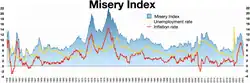 The misery index is an economic indicator, created by the American economist Arthur Okun. The index helps determine how the average citizen is doing economically and is calculated by adding the seasonally adjusted unemployment rate to the annual inflation rate. It is assumed that both a higher rate of unemployment and a worsening of inflation create economic and social costs for a country.[1]