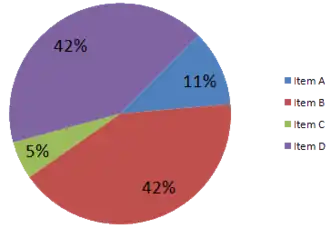 Item C appears to be at least as large as Item A in the misleading pie chart, whereas in actuality, it is less than half as large. Item D looks a lot larger than item B, but they are the same size.