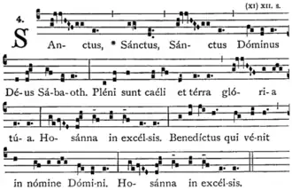In the Sanctus Palestrina quotes the same chant melody (from the Gregorian Mass XV) as in the Missa Papae Marcelli; the movement's opening also resembles the melismatic Sanctus of that mass. A comparison of the two melodies is shown at right.