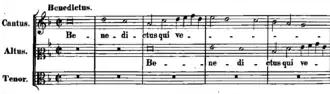The Benedictus is written for three voices, the soprano (cantus), the alto (altus), and the tenor. The opening motif is only three bars long before a variation on the melody is sung. Variations on this main melody are repeated throughout the piece.