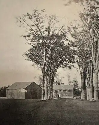 Built in 1728, on the town's lot number 91,[2][3] it stood at the rear of today's Holy Cross Cemetery on a bluff around 50 feet (15 m) immediately above the Royal River. It was used as a blockhouse, within a stockade, during the Indian wars. A tunnel was built from the home's cellar to the river. The dirt path that looks like it leads to the water is actually the town's original stage road, formerly lined with elm trees. As North Yarmouth's stagecoach travel increased in popularity, the stockade was removed and the home was enlarged to accommodate overnight guests. The original structure was made of clapboard; the extension, added on the northern side, was clad with shingles.[4]