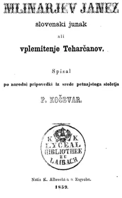 ![]() Title page for Mlinarjev Janez: Slovenski junak ali uplemenitba Teharčanov (1859) | |