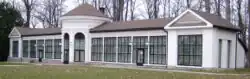 The park also features a classical garden pavilion with a round ground-plan and added lateral wings. The pavilion, with its large semicircular windows, is covered by a dome-roof. It was built in 1800 to serve as a greenhouse. Until recently it was used for storing tools for the maintenance of the park, then it was turned into an aqua-center with a sauna, massages, and a swimming pool. It is currently abandoned.