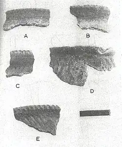 - Moccasin Bluff impressed exterior lip (56 vessels), characterized by distinctive rim and lip treatments, divided into 2 sub-groups.[3] Time period: prehistoric. Cultural affiliation: Late Woodland.