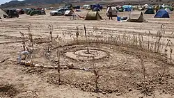 The Monegros Desert is noted for its Monegros Desert Festival, usually held in mid-July,[10] attracting numerous Spaniards and internationally renowned DJs and bands and some 40,000 people to its electronic music performances annually.[11] Formerly called the "Groove Parade" after being founded in 1992, it is held at the Finca Les Peñetes, roughly 18 kilometres (11 mi) west of Fraga, not far from Bujaraloz.[12] It is held in a windowless, graffiti-filled hall called Flarida, with an area of some 3,000 square metres (32,000 sq ft).[12]