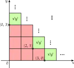 Let be a monomial ideal in where is a field. The ideal has a unique minimal generating set of of the form , where and . The monomials in are those monomials such that there exists such and [2] If a monomial is represented by the point in the plane, the figure formed by the monomials in is often called the staircase of because of its shape. In this figure, the minimal generators form the inner corners of a Young diagram.