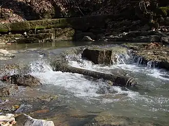 Kinney also built a dam on the creek about 200 yards upstream. The dam was about 15' tall and collected water which was channeled to the mill through a wooden trough. Remains of the dam can still be seen.