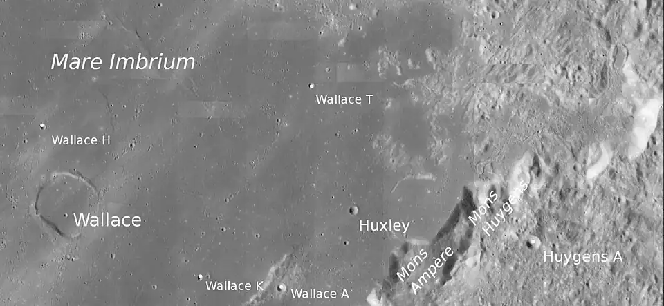 Mons Huygens is the highest mountain in the Moon's Montes Apenninus range. Adjacent to the west is Mons Ampère. The Montes Apenninus were formed by the impact that created Mare Imbrium. Mons Huygens rises 5,300 m (17,380 ft) from its Mare Imbrium base, per altimetry data from the Lunar Reconnaissance Orbiter.[1] The mountain was named after the Dutch astronomer, mathematician and physician Christiaan Huygens.[2] He is known for discovering Saturn's largest moon, Titan.