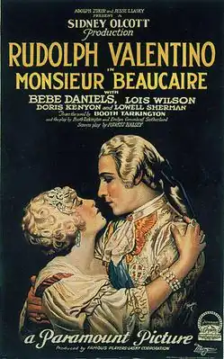 Monsieur Beaucaire is a 1924 American silent romantic historical drama film starring Rudolph Valentino in the title role, Bebe Daniels, and Lois Wilson. Produced and directed by Sidney Olcott, the film is based on Booth Tarkington's 1900 novel of the same name and the 1904 play of the same name by Tarkington and Evelyn Greenleaf Sutherland.[2]