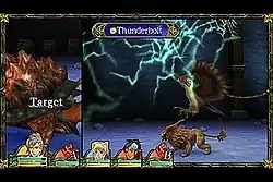 In combat, each Jewel Summoner can bring out one monster at a time. Every turn, each monster (both enemy and ally) can activate one attack or elemental ability.[4] Each monster initially has four slots available for abilities. Monsters can quickly learn abilities of their own element type, but can also pick up abilities from other elements.[6] A fire dragon, for instance, can learn snow-based attacks.[7] Using an ability requires the expenditure of a monster's "Jewel Points", a mana-like energy of which each creature has only a finite amount. When a monster's Jewel Points are depleted, it becomes inaccessible to the character and another monster must be selected to fight.[6] Monsters can return to battle when their Jewel Points have been restored at a save point.[7]