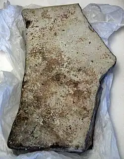 The Montastruc decorated stone (Palart 518) is an example of Ice Age art, now in the British Museum. A human figure that appears to be female has been scratched or engraved to decorate a fragment of limestone used as a lamp. The piece was excavated from Courbet Cave, Penne, Tarn, Midi-Pyrénées, France, on the northern bank of the river Aveyron, a tributary of the Tarn. It is dated to around 11,000 BCE, locally the Late Magdalenian culture during the Upper Palaeolithic, towards the end of the last Ice Age. It was excavated by Edouard Lartet and Henry Christy in 1863, and among other items bequeathed to Christie's museum.