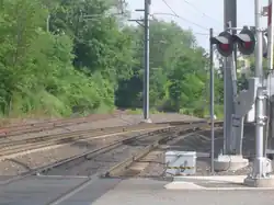 New track alignment to Hoboken curves to the right; old alignment (now single-tracked) veers to the left