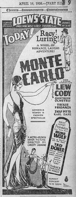 - ^ a b Pardy, George T. (April 10, 1926), "Pre-Release Review of Features: Monte Carlo", Motion Picture News, 33 (15), New York City, New York: Motion Picture News, Inc.: 1617, retrieved April 17, 2023