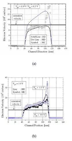 The accuracy of semiclassical models are compared based on the BTE by investigating how they treat the classical velocity overshoot problem, a key short channel effect (SCE) in transistor structures. Essentially, velocity overshoot is a nonlocal effects of scaled devices, which is related to the experimentally observed increase in current drive and transconductance.[5] As the channel length becomes smaller, the velocity is no longer saturated in the high field region, but it overshoots the predicted saturation velocity. The cause of this phenomenon is that the carrier transit time becomes comparable to the energy relaxation time, and therefore the mobile carriers do not have enough time to reach equilibrium with the applied electric field by scattering in the short channel devices.[6] The summary of simulation results (Illinois Tool: MOCA) with DD and HD model is shown in figure beside. In the figure (a), the case when the field is not high enough to cause the velocity overshoot effect in the whole channel region is shown. Note that at such limit, the data from the DD model fit well to the MC model in the non-overshoot region, but the HD model overestimate the velocity in that region. The velocity overshoot is observed only near the drain junction in the MC data and the HD model fits well in that region. From the MC data, it can be noticed that the velocity overshoot effect is abrupt in the high-field region, which is not properly included in the HD model. For high field conditions as shown in the figure (b) the velocity overshoot effect almost all over the channel and the HD results and the MC results are very close in the channel region.