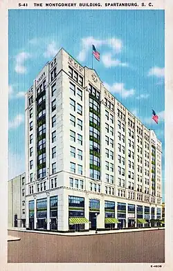 The Montgomery Building, listed on the National Register of Historic Places, is an iconic building located on Church Street in Spartanburg, Spartanburg County, South Carolina. It was built in 1924, and is a ten-story, nine-bay-wide, steel frame skyscraper faced in precast concrete. It originally housed the offices of textile companies, cotton brokers, and factories. The building also contained a theatre/auditorium space, a radio and television station. The Montgomery Building was the tallest building in Spartanburg until the 1950s.[2][3] In 2016, a developer announced a $29 million plan to renovate the building for mixed-use to include apartments, offices and retail.[4] Restoration began in Spring 2017 and was completed in December 2018.[5]