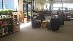 The Montpelier High School library media program is constantly evolving to best meet the needs of students, staff and community members. The fiction collection is continuously expanded and updated with newly-published and classic books in various formats. The non-fiction and reference collection is kept current with online database subscriptions. The library website allows access to these databases, online newspapers, the library catalog, research support, tech and social media tips as well as reading suggestions. These services are available 24/7 from any device with internet access or in the library during school hours. Multimedia equipment (video and audio recorders, tripods, laptops and other devices) are also available for school related projects. The space is open, light filled, flexible and accessible and hosts a wide range of academic, social and civic activities throughout the year.[10]