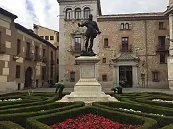 The Monument to Álvaro de Bazán is an instance of public art in Madrid, Spain. Located at the Plaza de la Villa, it consists of a bronze sculpture designed by Mariano Benlliure representing Álvaro de Bazán—a noted 16th century Admiral of the Spanish Navy once described by Cervantes as "father of soldiers, lightning of war, fortunate and never defeated captain"—[1] put on top of a stone pedestal.
