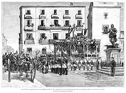 It was officially unveiled on 19 December 1891, at its location in the Plaza de la Villa, during a ceremony presided by queen regent Maria Christina of Habsburg-Lorraine.[4] The inauguration was also attended by the Infanta Isabella, Alejandro Pidal y Mon, Prime Minister Antonio Cánovas del Castillo, a number of additional government ministers, several generals and members of the councils of the Ayuntamiento and the Provincial Deputation, among others.[5]