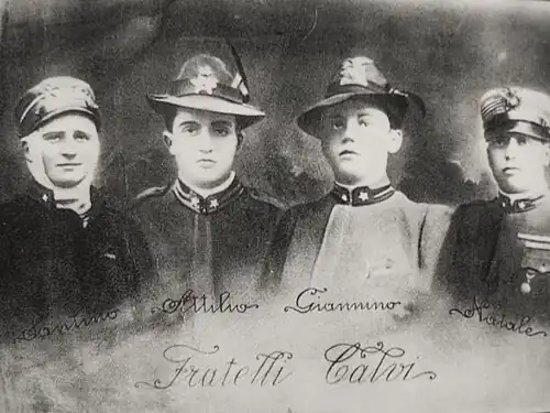 The monument is a pentagonal plinth, made with marble Zandobbio with a flagpole with the Italian flag atop. On the superior register of the plinth are four bronze nude youths symbolizing the four brothers: Natale (1887 – 1920), Attilio (1889 – 1916), Sante (1895 – 1917), and Giannino (1899 – 1919) who died after service to the nation.[1] In 1921, a ceremony honoring them and their mother was attended by the King, Benito Mussolini, and Gabriele D'Annunzio. Above each male statue are bronze eagles. The fifth side has a striding youthful maiden symbolizing Victory. The marble is simply engraved with the phrase AI FRATELLI CALVI (which translates to TO THE CALVI BROTHERS). The marble of this middle register has plaques engraved with depictions of battles in which the brothers were involved.