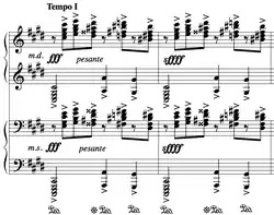 The fourth piece, called Polichinelle (Полишинель, Polishinyelʹ), is in an ambiguous key although often referred to as "in F♯ minor" (the F♯ minor triad has never been established throughout), and played Allegro vivace. It is a character piece, based on the Commedia dell'arte character Pulcinella (Polichinelle is the French translation of this word) from which Punch (from Punch and Judy) derives. It is in ternary form (ABA), beginning and ending with a fast section that gives way to a slower, lyrical melodious passage in the middle.