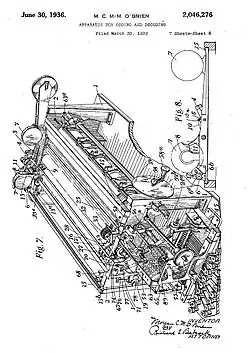 In April 1928, Morgan O'Brien applied for a patent "Improvement in or relating to Means or Apparatus for Encoding and De-Coding Messages" (GB320315,[4] US 2046276[5]). This was a remarkably complex typewriter style cipher device, and unlike anything that Morgan had patented before. It attracted the attention of official sources who funded the building of 3 machines for test – one for each of the armed services. There was also interest from America where the U.S. Navy's cipher expert, Lieutenant J.N. Wenger, said it created a "tremendously long and complex cipher". He had recently reviewed Enigma and could see that the O'Brien system offered vastly more "starting points" than Enigma.[1] W. Watson & Sons Ltd, a leading instrument maker, built the prototypes. The prototypes weren't complete until Autumn 1931, and there were teething troubles that revealed the machines to depend on "absolute accuracy of the timing, registering or meshing of certain parts". This let to problems with the prototypes, and in-spite of continued development and a further patent in 1935 (GB453660[6]), it appears to be this that ultimately led to the failure to secure orders, although there were some commercial difficulties also.