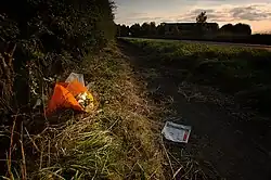Aftermath of a motorcycle accident. A wrapper from a defibrilation system and some flowers.Soft tissue (skin and muscle) damage (road rash) as the body slides across the surface. This can be prevented entirely with the proper use of motorcycle-specific protective apparel such as a leather jacket or reinforced denim and textile pants.