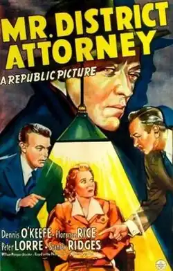 Mr. District Attorney is a 1941 American comedy crime film directed by William Morgan and written by Karl Brown and Malcolm Stuart Boylan. The film was based on the long-running and popular radio series Mr. District Attorney. It stars Dennis O'Keefe, Florence Rice, Peter Lorre, Stanley Ridges, Minor Watson and Charles Arnt.[1] The film was released on March 27, 1941, by Republic Pictures.[2][3][4] A sequel followed it, Mr. District Attorney in the Carter Case, later in the year, with different actors in the leading roles.
