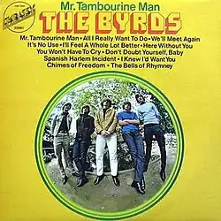 Mr. Tambourine Man is the debut studio album by the American rock band the Byrds, released on June 21, 1965, by Columbia Records.[1] The album is characterized by the Byrds' signature sound of Jim McGuinn's[nb 2] 12-string Rickenbacker guitar and the band's complex harmony singing.[2] The material on the album consists of cover versions of folk songs, primarily composed by Bob Dylan, and originals written or co-written by singer Gene Clark.[3] Along with the Dylan-penned single of the same name, Mr. Tambourine Man established the band as an internationally successful act[4] and is widely regarded by critics as representing the first effective American challenge to the chart dominance of the Beatles and other British Invasion bands during the mid-1960s.[3][5]