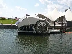 Mr. Trash Wheel is a moored vessel that removes trash from the mouth of the Jones Falls stream at Baltimore's Inner Harbor.[1][2] Rubbish from the streets of Baltimore flushes into storm drains that empty into Jones Falls. The floating trash is then carried by the river to its outlet into the Inner Harbor, where it is captured by Mr. Trash Wheel.[3] The water wheel can be controlled remotely on the Internet.[4] Mr. Trash Wheel was constructed using $720,000 of public and private funding.[4]