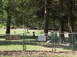 The Mt. Zion cemetery is located just behind, to the west of the church building. It is surrounded by a chain link fence and is regularly cared for. As of April 2007, there were 222 graves known. Burials still occur there.[6]