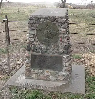 The telegraph station, that served till 1876 proved a savior for Mud Spring Station, when an attack by the Sioux and Cheyenne Indians in the Battle of Mud Springs was thwarted by a SOS telegraph sent to US troops and the subsequent arrival of reinforcements to counter the attack. Today, as the last vestige of the Mud Spring Station, a stone monument, inlaid with a bronze Pony Express plaque, stands at the historic site.[5]