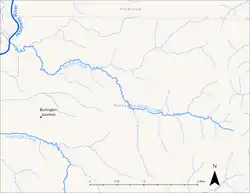 The stream begins just west of Toad Hollow and traverses northwesterly, passing north of Burlington Junction, to the Nodaway River.
